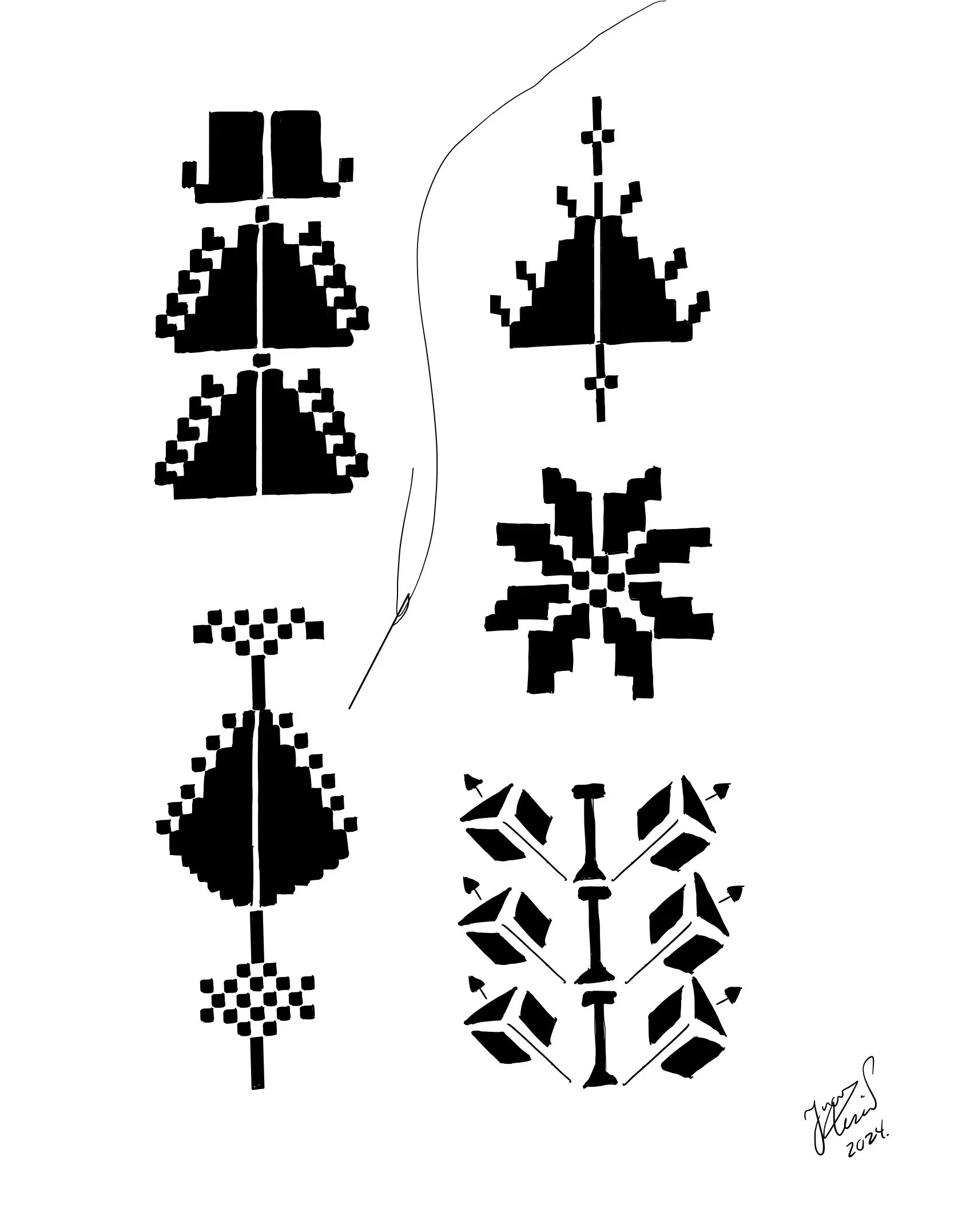 (*artwork: ‘Tatreez motifs’ drawn by Incé Husain. Top left: cypress tree from Beer Sabi; bottom left: cypress tree from Gaza; top right: cypress tree from Ramallah; middle right: Bethlehem moon; bottom right: coffee bean from Gaza.)