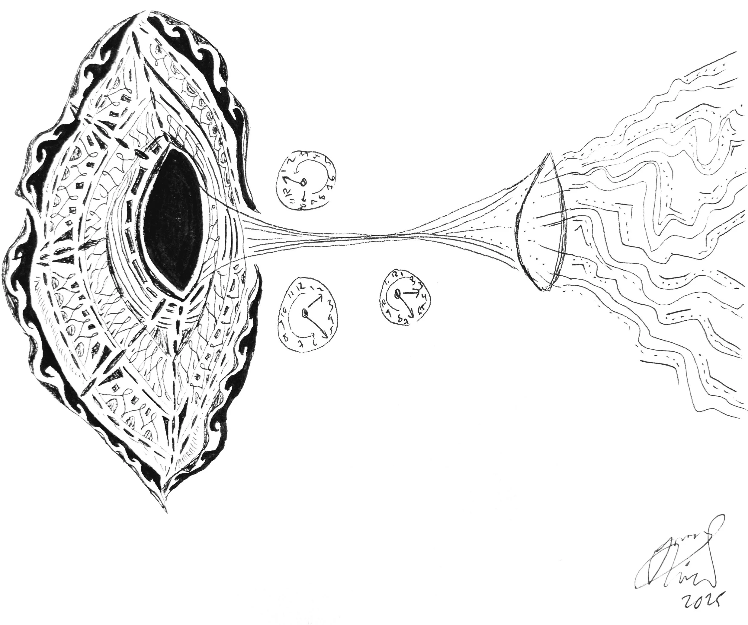 “We are inside a black hole, we’ve fallen into the center, and then we go through this jump, and now we find ourselves still in the funnel,” Rovelli illustrates. “But now the funnel is not shrinking, it’s opening up.” Artwork by Incé Husain.