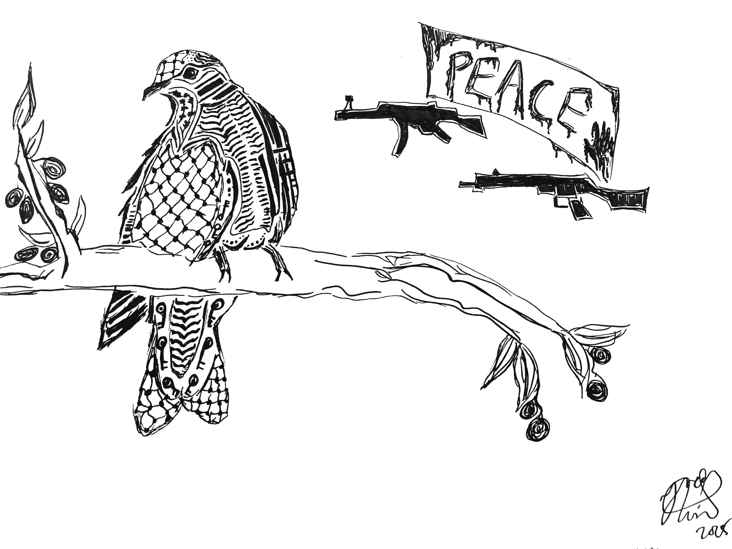 (“We do not make peace with colonizers”; a liberation dove filled with keffiyeh designs and keys is perched on an olive tree and turns away from a colonizer’s peace defined by bloodshed. Artwork by Incé Husain.)