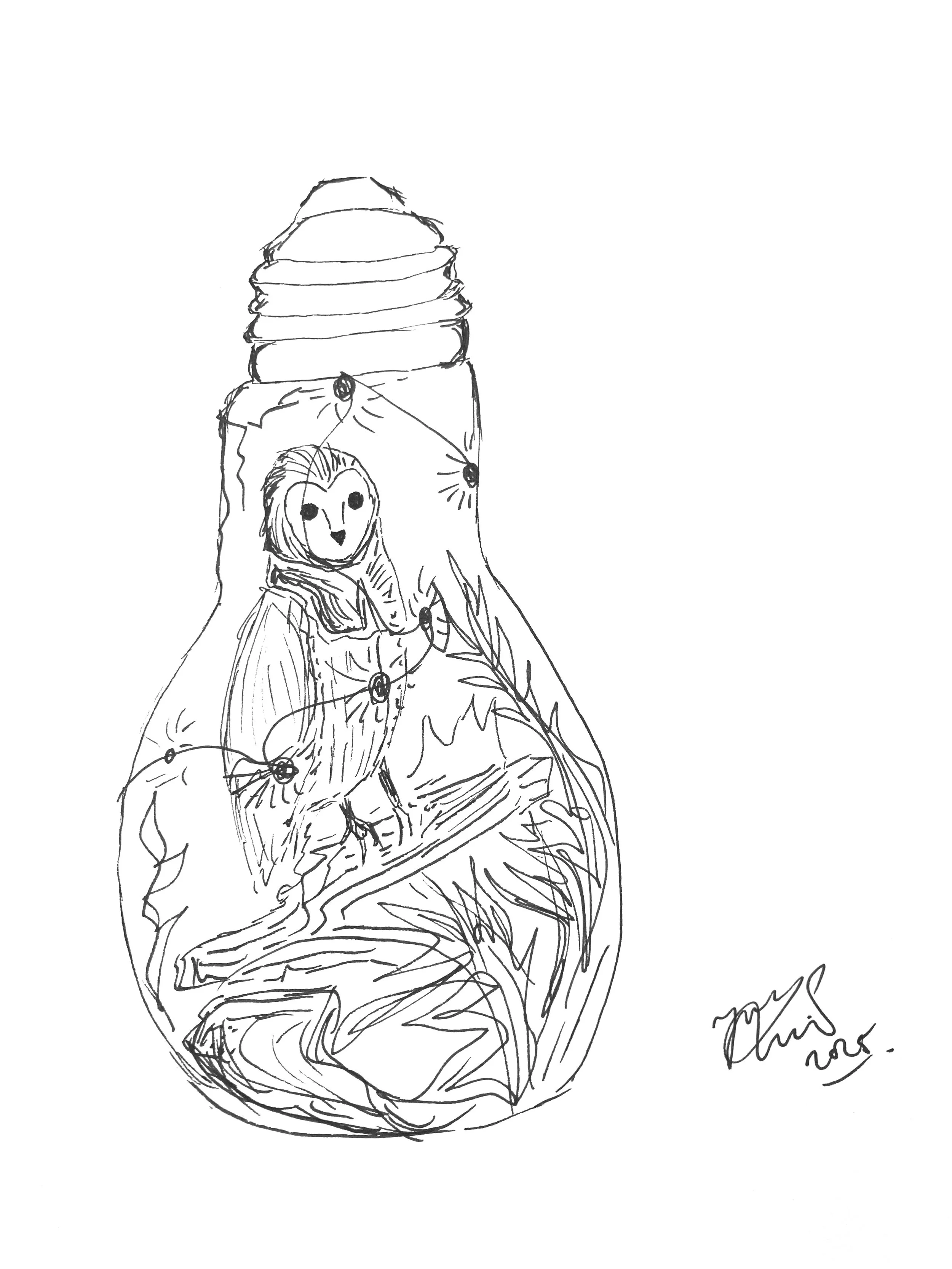 (An art piece created by John Gilmour features green fairy lights, leaves, twigs, and a barn owl figurine arranged inside a glass bulb. Artwork ‘Owl in a bulb’ by Incé Husain.)